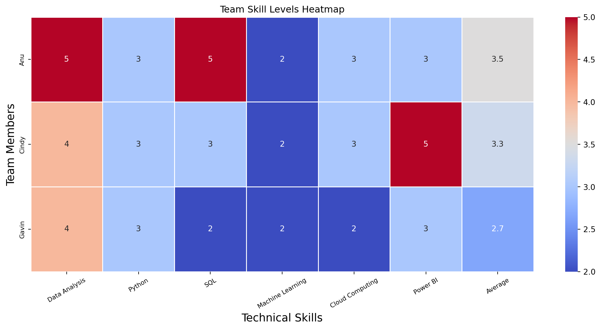 When looking at the heatmap it shows that our team still feels relatively new to these technical skills and highlighted in blue are the most notable areas for growth. One person in our group is a Business Analyst while the other two do not use these tools on a daily basis and due to this lack of exposure is likely to contribute to a lack of technical skill observed in the heatmap. Increased exposure and experience outside of an educational setting could contribute to increased technical skills within the group.