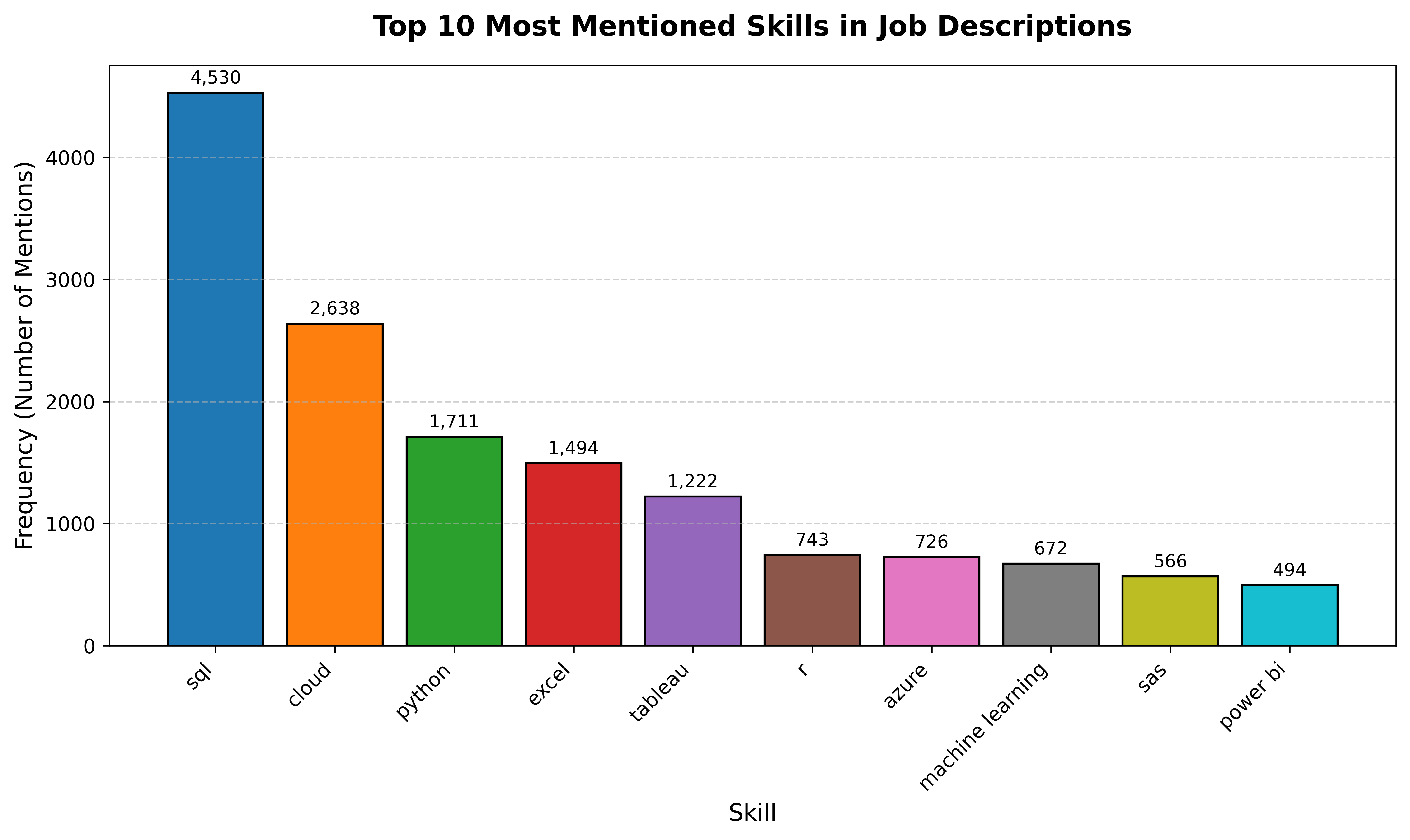 import matplotlib.pyplot as pltimport numpy as npskills, counts =zip(*skill_counts.most_common(10))# Make figure taller for vertical bars, and increase quality of graphicplt.figure(figsize=(10, 6), dpi=300)# Unique color per barcolors = plt.cm.tab10(np.linspace(0, 1, len(skills)))# Plot vertical barsbars = plt.bar(skills, counts, color=colors, edgecolor="black")# Titles and labelsplt.title("Top 10 Most Mentioned Skills in Job Descriptions", fontsize=14, fontweight="bold", pad=15)plt.xlabel("Skill", fontsize=12)plt.ylabel("Frequency (Number of Mentions)", fontsize=12)# Rotate x labels for readabilityplt.xticks(rotation=45, ha="right", fontsize=10)plt.yticks(fontsize=10)# Add values on top of barsfor bar in bars: plt.text(bar.get_x() + bar.get_width()/2, bar.get_height() +max(counts)*0.01,f"{bar.get_height():,}", ha="center", va="bottom", fontsize=9, color="black")# Gridlines and layoutplt.grid(axis="y", linestyle="--", alpha=0.6)plt.tight_layout()plt.show()